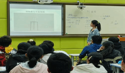 在高二(6)班,王亚超同学从六大营养物质中为人体持续供能的物质——油脂引入,课程知识内容准备十分详细,充分与学生开展互动,以一则肥皂由来的小故事吸引了全班的注意力,引起了大家对制肥皂的兴趣。在高二(3)班,安芳宁同学则是以曾经是世界上最胖的男子英国基思·马丁来引出本节课的学习内容,与学生的配合十分流畅,由油脂的结构到油脂的化学性质再到油脂的用途,每个环节都很详细讲解。最后是尹邓雨同学的讲课,与前两位同学的导入也是迥然不同的,她以生活中常吃的蛋糕引入,奶油其实是油脂成分浓缩而得。同学们联系生活实际从生活现象中让学生了解油脂的物理性质,从官能团的角度来学习油脂的化学性质。