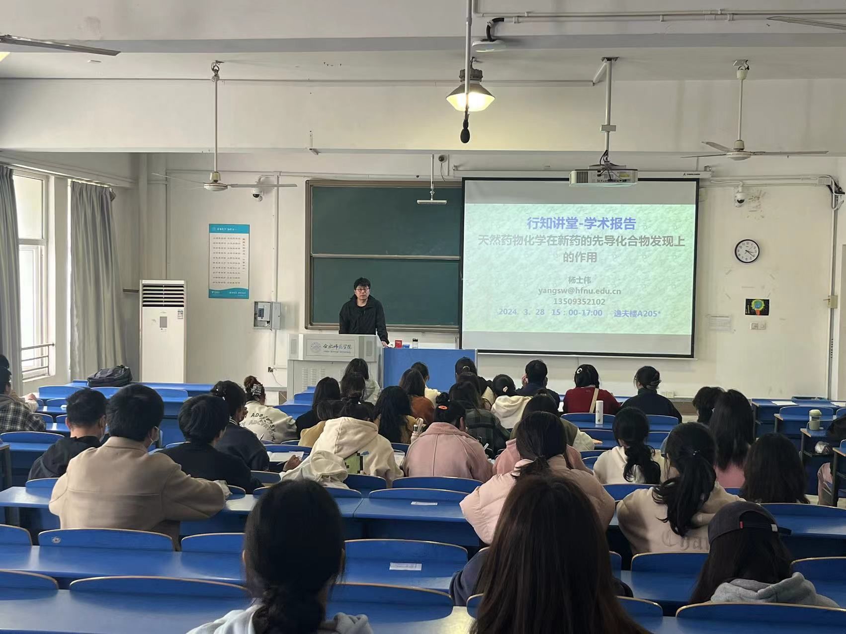 3月28日下午,十大买球的正规网站杨士伟老师在锦绣校区逸夫楼A205教室做了题为“天然药物化学在新药的先导化合物发现上的作用”的学术报告,20级制药工程,22级制药工程,23级制药工程等专业的100多名学生参加了报告会。