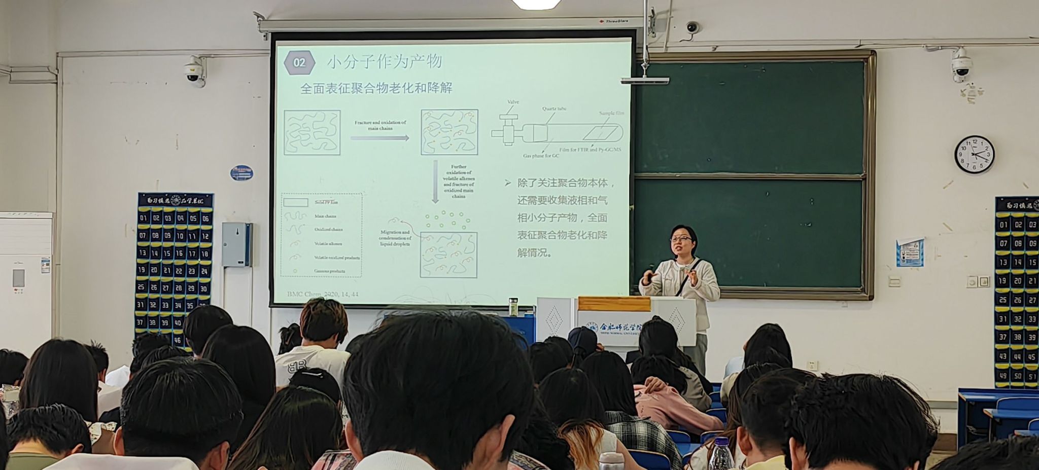 刘璇老师从航天器O型密封环失效事故讲起,用生动形象的语言阐释了聚合物老化和降解的概念,用人的衰老比喻聚合物的老化过程,引起了大家的思考,激发了同学们的求知热情。在报告过程中,刘老师详细介绍了小分子作为产物和传染媒介在聚合物老化和降解研究中的作用,例如全面表征聚合物老化和降解、实现稳定性的快速测定、剖析橡胶密封材料的失效机理等。报告的最后,刘老师展望了利用小分子对聚合物老化和降解进行主动调控的可能,以及小分子作为重要表征指标在文物保护领域和微塑料检测中的应用。