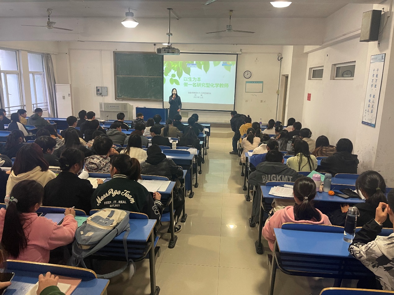本网讯 为进一步帮助化学专业学生了解一线教师技能,教师职业必备和当前教师行业的就业现状,以及新时代教育的发展。11月23日,化学与化学工程学院在锦绣校区逸夫楼A104教室举办专题教育见习讲座。合肥市教育名师工作室主持人、合肥46中海恒分校校长刘亮荣,包河区化学学科带头人、合肥48中滨湖校区徐蓉作主题讲座。全体2020级化学专业学生参加了学习,讲座由化学系主任凌波主持。