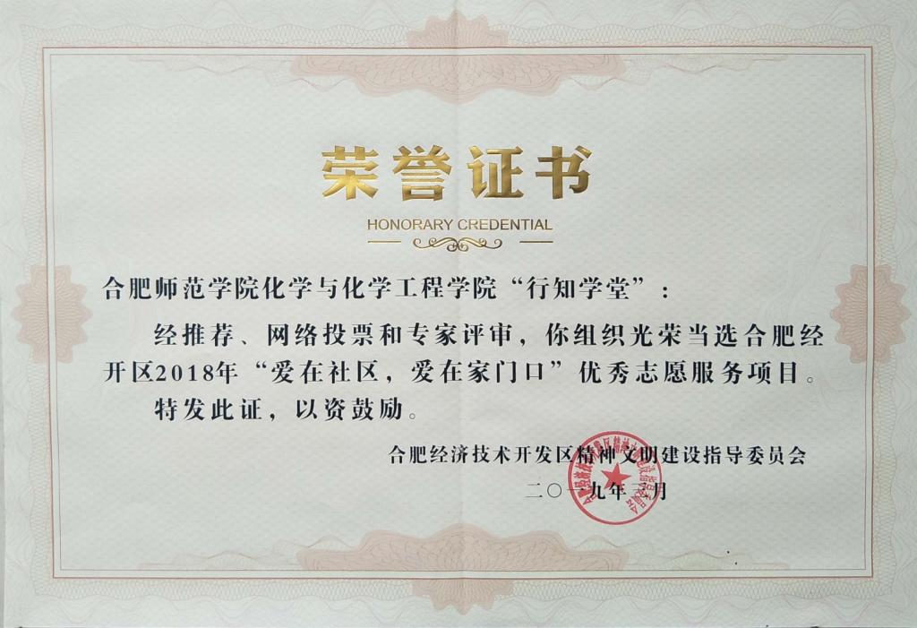 合肥市经济技术开发区精神文明建设指导委员会于2018年12月启动该区优秀志愿服务评选工作,设优秀个人、优秀组织、优秀项目三类。经海恒社区初步遴选,化学与化学工程学院“行知学堂”志愿服务项目作为该社区的重点推荐项目参与经开区优秀项目评选。评审组认为该学院项目工作开展有序、内容设计科学、组织实施连续、服务受众广泛。经过网络票选、专家评审,该院“行知学堂”从全经开区15个参与终审的项目中脱颖而出荣获优秀项目。