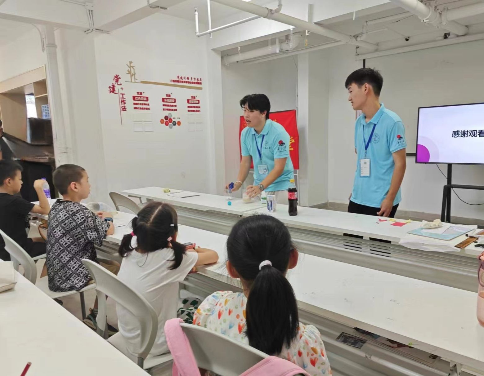 “同学们,你们看可乐现在变成什么颜色了呢?”“变成了乳白色”,“它的形状有什么变化?”“变成了颗粒状”,“那它为什么变成这个颜色,同时形状也发生了改变呢?”......这是锦绣青年“唯履知新”科普服务队正在开展的“过氧化氢分解,蛋白质变性”的科普课程。