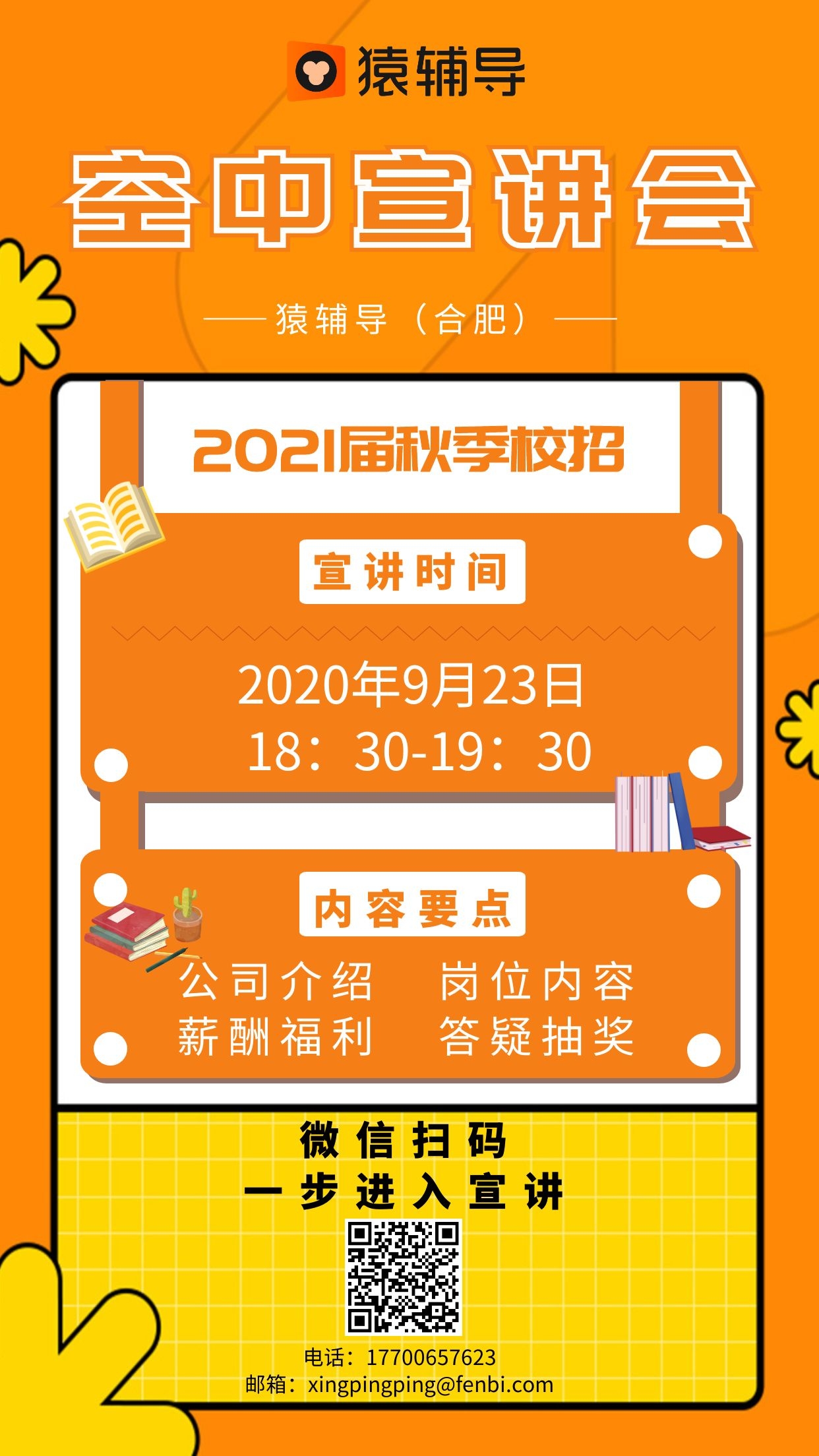 5.合肥猿文教育科技有限公司 是猿辅导在合肥设立的分公司,猿辅导是国内领先的K12在线教育公司,总部在北京,目前已在全国设立12家分公司,公司在职人员超过30000人,是估值达130亿美金的“独角兽”企业。旗下包括(猿辅导)猿辅导)(猿题库)(小猿搜题)(小猿口算)等核心教育APP产品。其中猿辅导在线用户量已突破4亿。2020年2月,猿辅导在线教育入选“CCTV品牌强国工程”。2020年7月,猿辅导成为2022年冬奥会和冬残奥会官方赞助商。招聘岗位:在线辅导运营老师,统招本科学历,专业不限。联系方式:17700657623(微信同号)。公司地址:合肥市蜀山区华润大厦