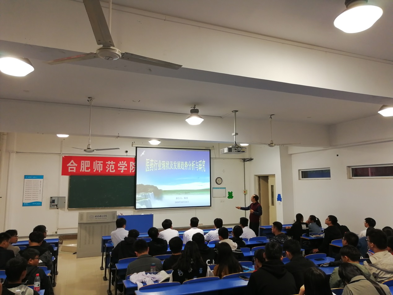 本网讯10月28日下午,“行知讲堂”学术报告在锦绣校区逸夫楼A209教室举行。本场报告由化学与化学工程学院陈虎副教授主讲,主题为“医药行业现状及发展趋势分析与研究”,药物制剂专业学生聆听了学术报告,报告由药物制剂系赵明老师主持。