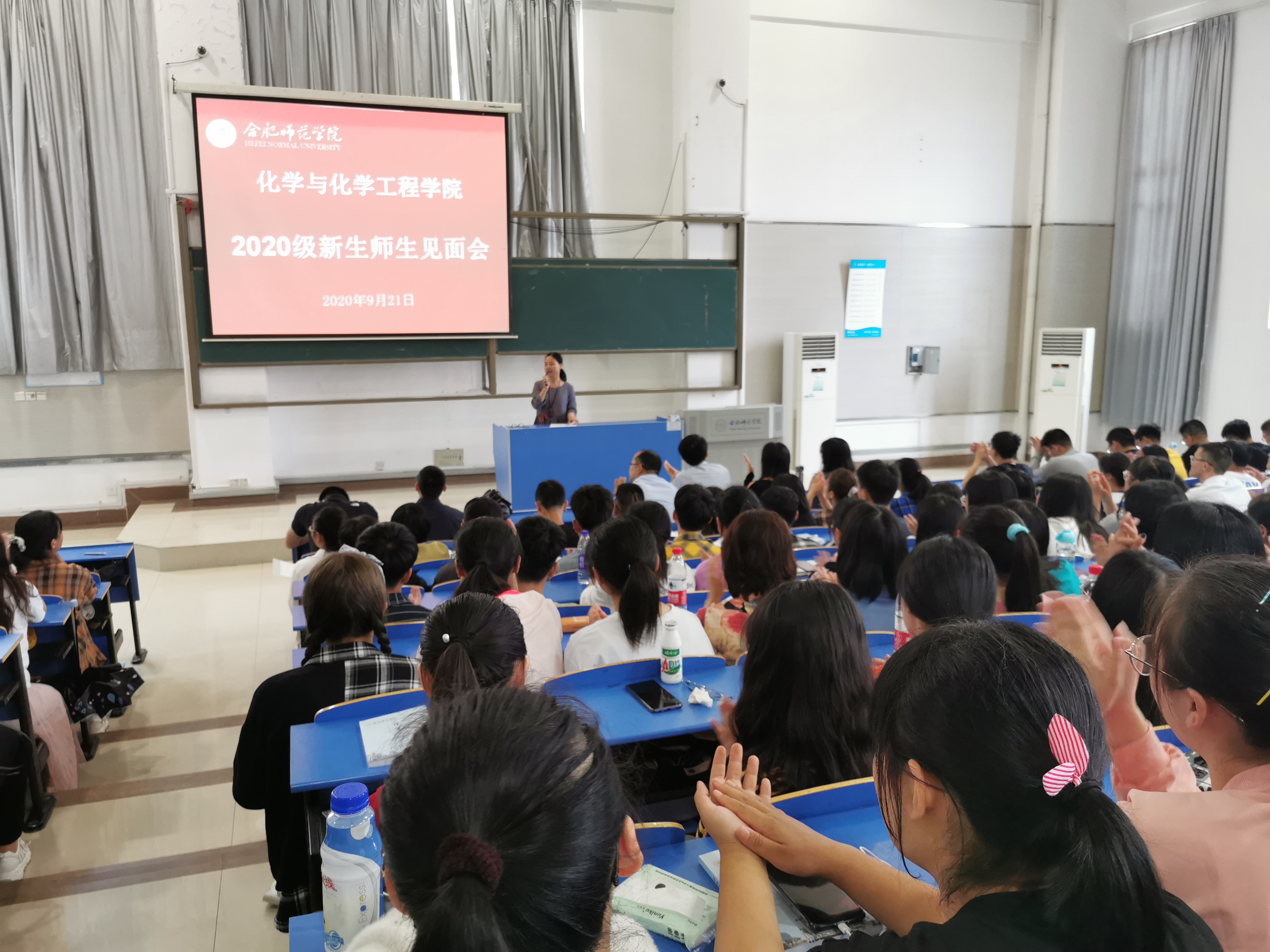 9月21日上午,在逸夫楼西阶3教室举行了全体新生见面会,院党政领导董华泽、徐祝青,各系教研室主任、全体辅导员、学业导师、党政秘书、教学秘书以及全体新生参加。大会开始,徐祝青请各党政领导及教研室主任为所有新生送上了一句祝福语,拉开了本次见面会的序幕。随后,董华泽从师资力量、创新创业成果、考研率及就业率等方面对学院做了详细的介绍,为同学们刻画了清晰的化学与化学工程学院的形象。2019级制药工程专业的张卓佳作为老生代表讲述了她在校学习一年的成长、收获和改变,鼓励学弟学妹们追求梦想、努力奋斗。2020级新生代表盛雨洁同学呼吁同学们严格要求自己、刻苦学习技能本领,在学校度过无悔的青春岁月。最后,本次全体新生见面会在同学们热烈的掌声中宣告结束。