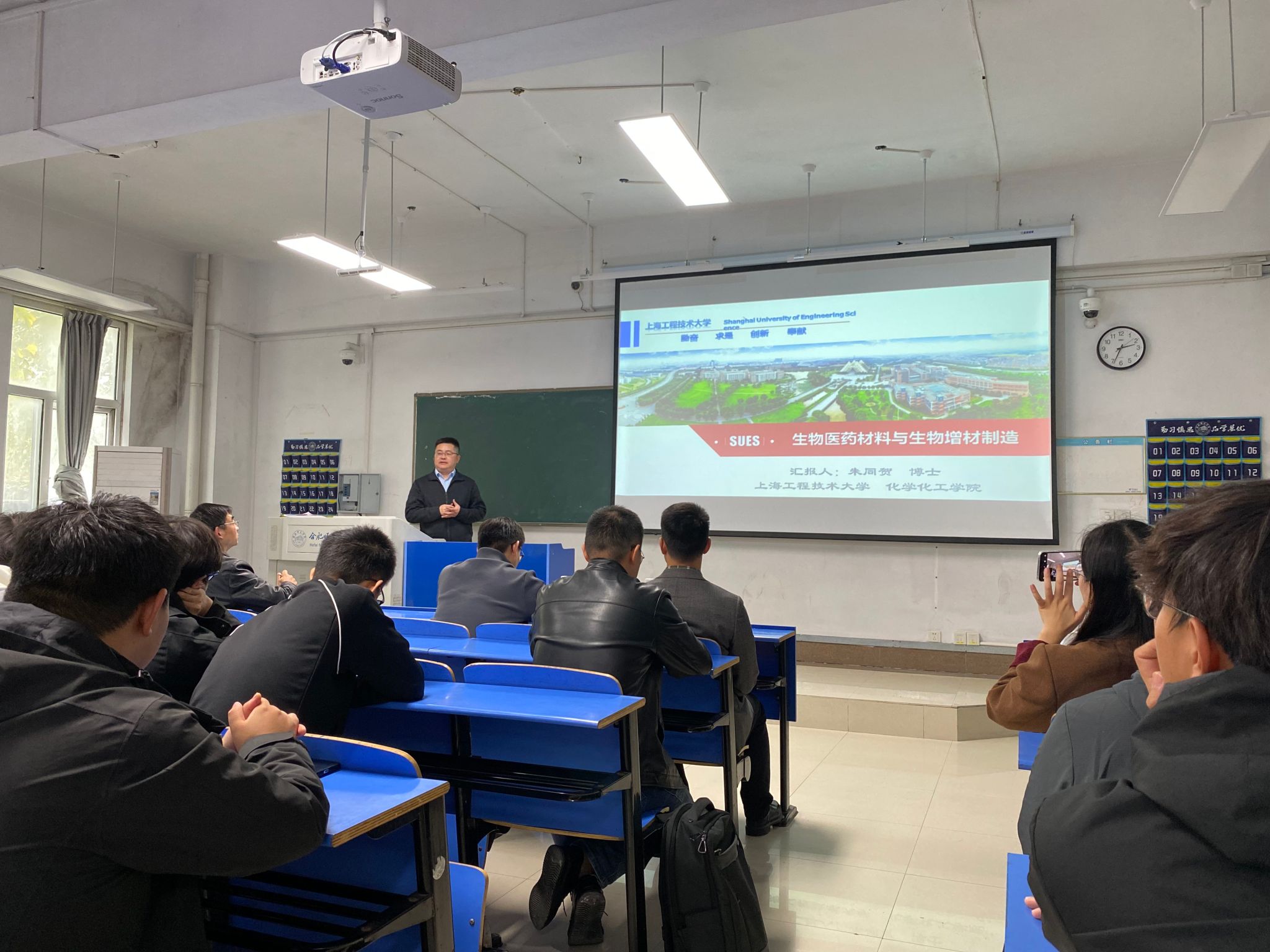 本网讯 10月31日下午,十大买球的正规网站2012届优秀校友、上海工程技术大学教授朱同贺应邀返回母校,在锦绣校区逸夫楼A103为以十大买球的正规网站师生为主的全校师生作了题为“生物医药材料与生物增材制造”的讲座。讲座由十大买球的正规网站院长朱金苗主持,学院副院长董雄辎、教师代表及相关专业学生参加。